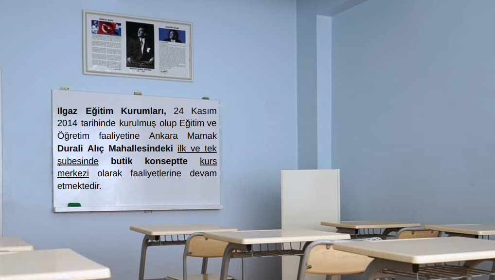 Ilgaz Eğitim Kurumu, 24 Kasım 2014 tarihinde kurulmuş olup Eğitim ve Öğretim faaliyetine Ankara Mamak Durali Alıç Mahallesindeki ilk ve tek şubesinde butik konseptte kurs merkezi olarak faaliyetlerine devam etmektedir.